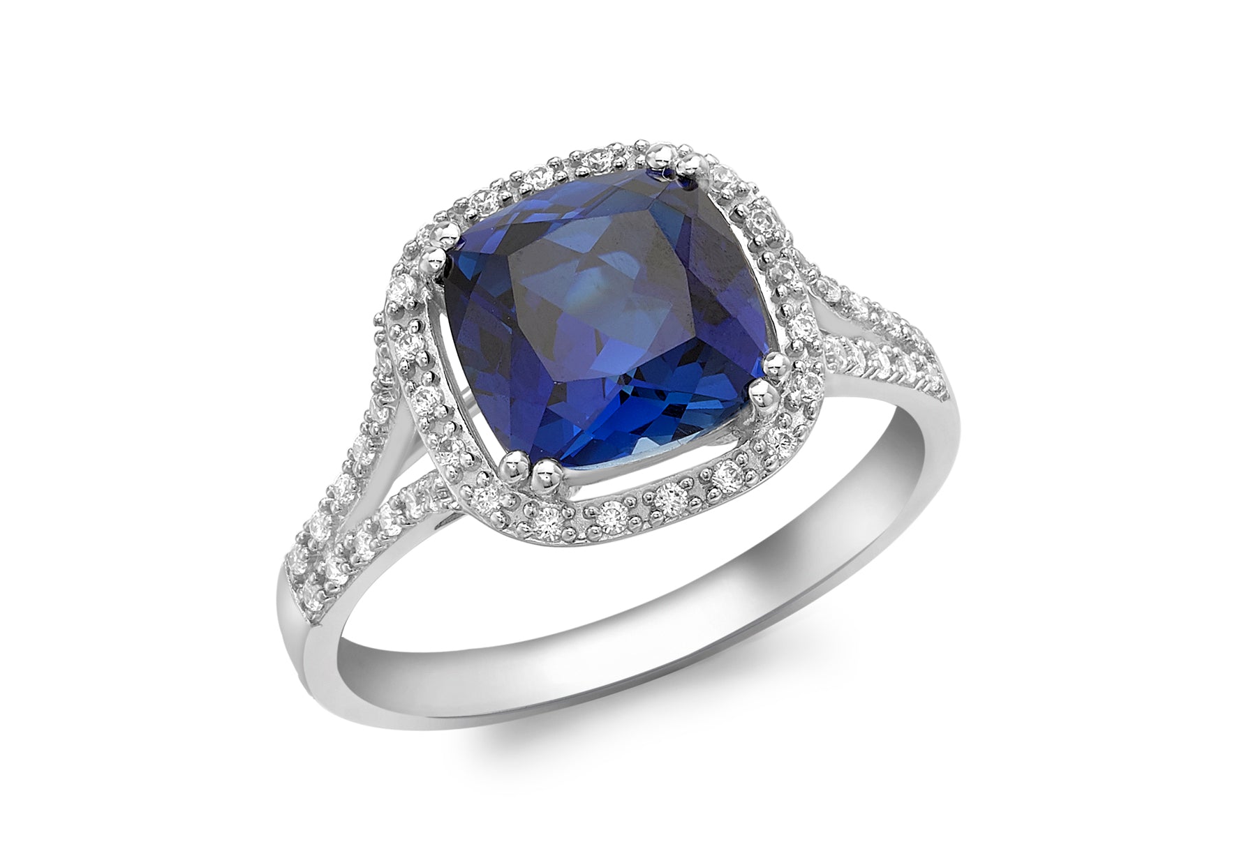 Details: Ring Face 12mm; Ring Shank: 2.2mm; Finish: Polished; Setting: Claw; Stone Details: 1 x 9mm x 9mm Cushion Created Blue Sapphire, 44 x 1mm Round White CZs; Style: Stone Set Metal Colour: White Metal: 9ct Gold