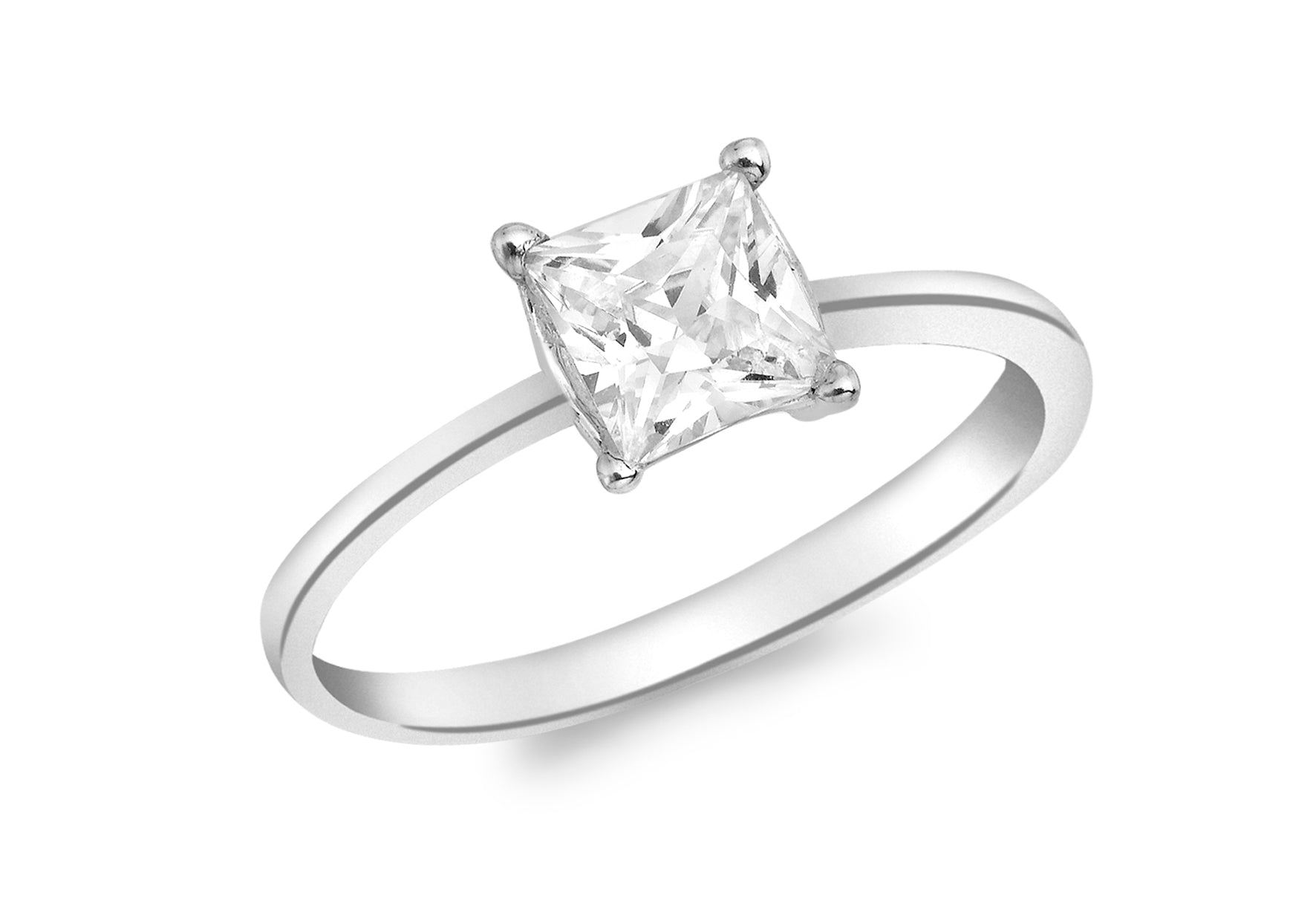 Ring Shank: 1mm Finish: Polished Setting: Claw Stone Details: 1 x 5mm x 5mm Square White CZ Style: Stone Set Product Type: Rings Metal Colour: White Metal: 9ct Gold