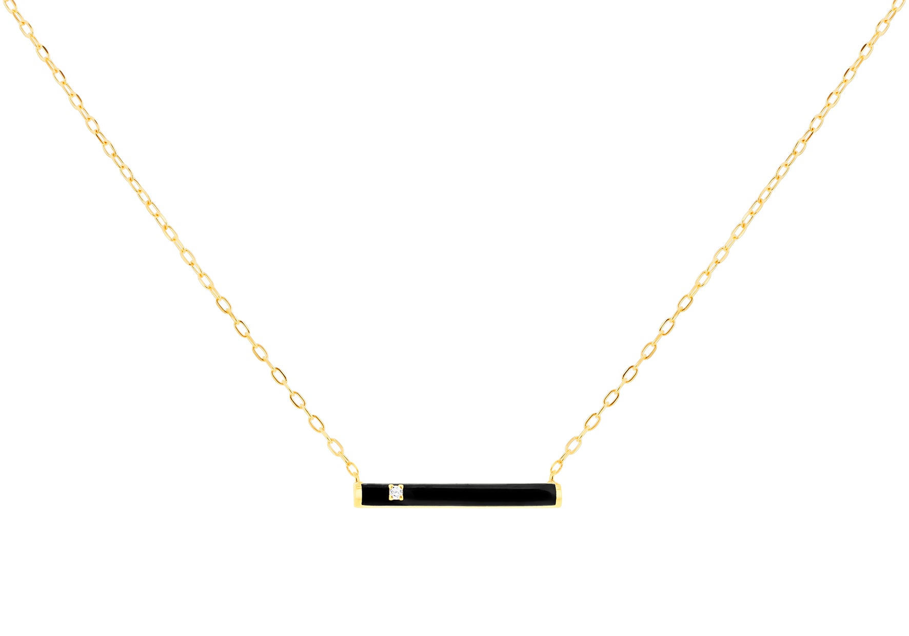 Meticulously designed, the centerpiece of this necklace features a sleek black enamel bar, exuding an air of sophistication and intrigue. The lustrous solid 9ct yellow gold setting adds a warm and luxurious touch. At the heart of the black enamel bar is a dazzling 0.01ct diamond that sparkles with brilliance.