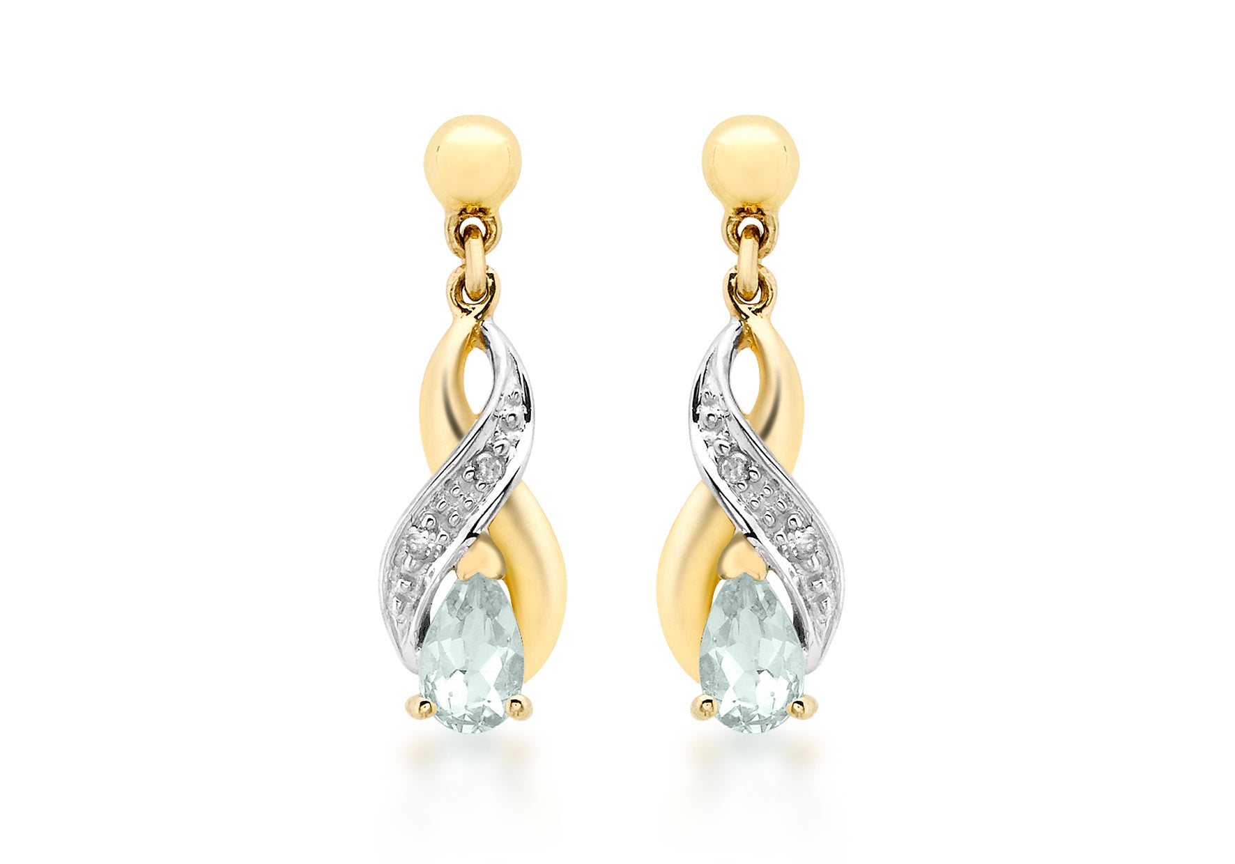 9ct Yellow Gold 0.02t Diamond and Aquamarine Crossover Drop Earrings