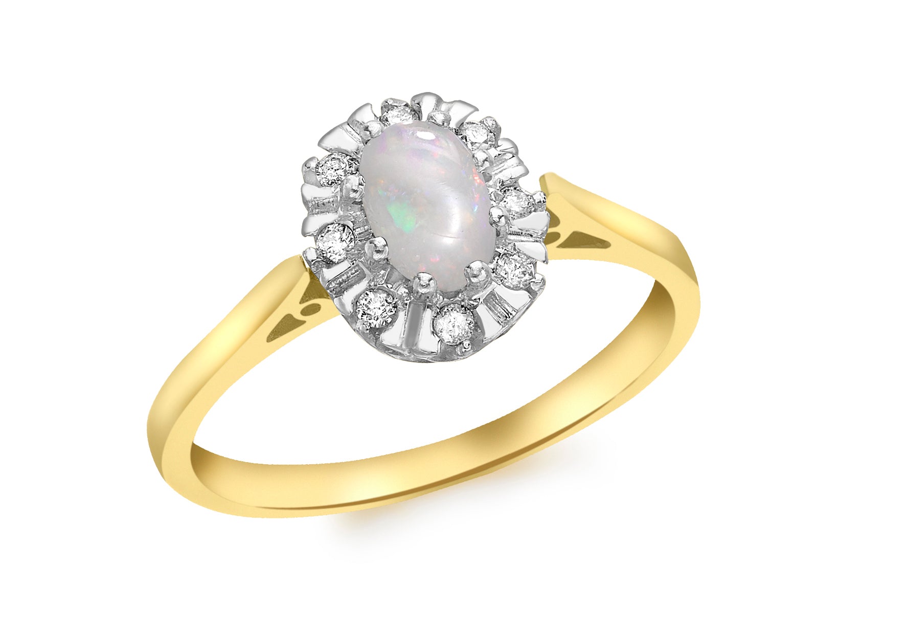 Average Carat Weight: 0.08ct Ring Shank: 1.8mm Finish: Polished Setting: Claw Stone Details: 8 x Round Diamonds, 1 x 5mm x 7mm Oval Opal Style: Stone Set Product Type: Rings Metal Colour: Yellow Metal: 9ct Gold