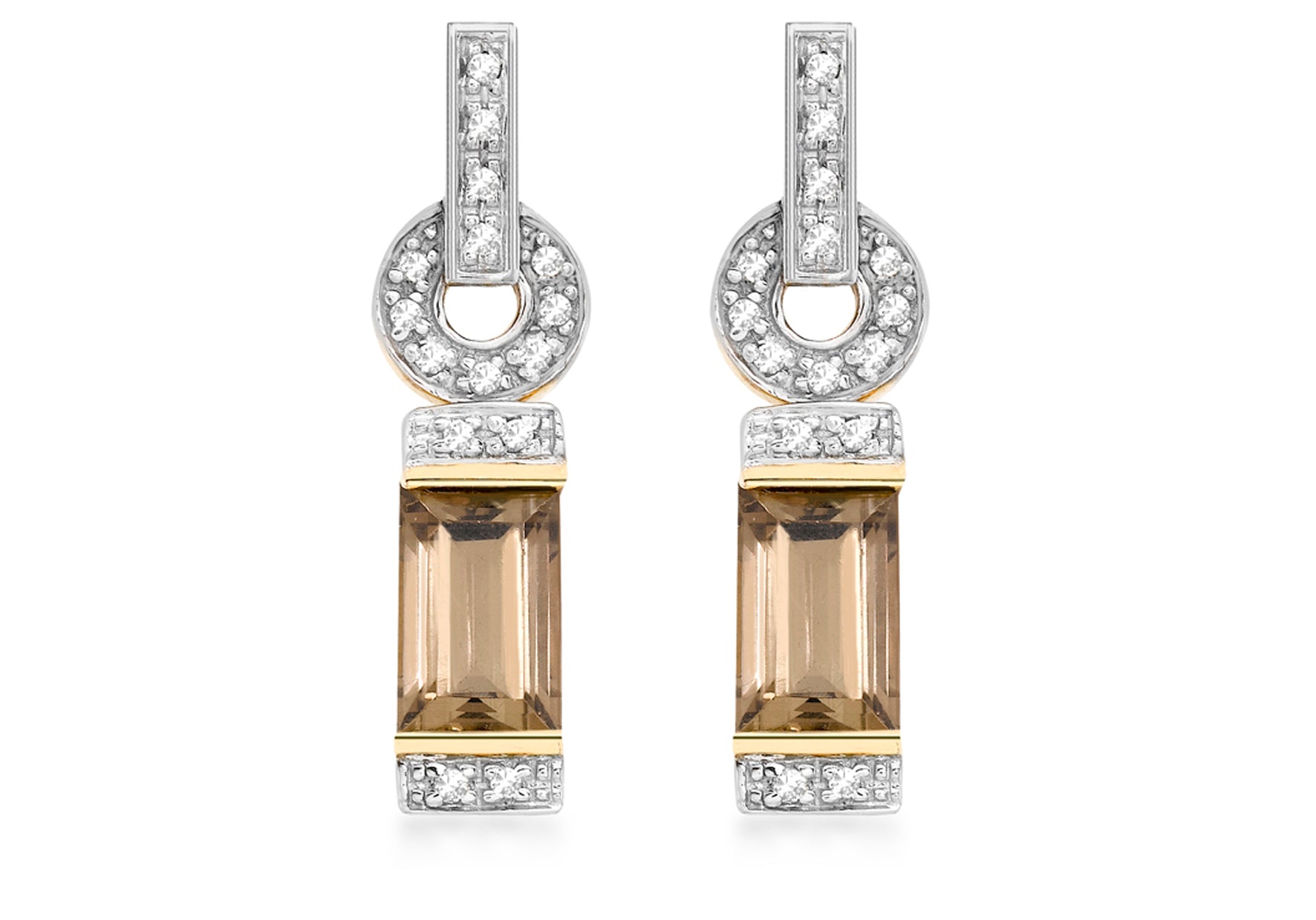 Average Carat Weight: 0.15ct Width: 7mm Height: 24mm Fitting: Post Setting: Pave Stone Details: 7x5mm Smokey Quartz Gemstone Style: Drop Product Type: Earrings Metal Colour: Yellow Metal: 9ct Gold