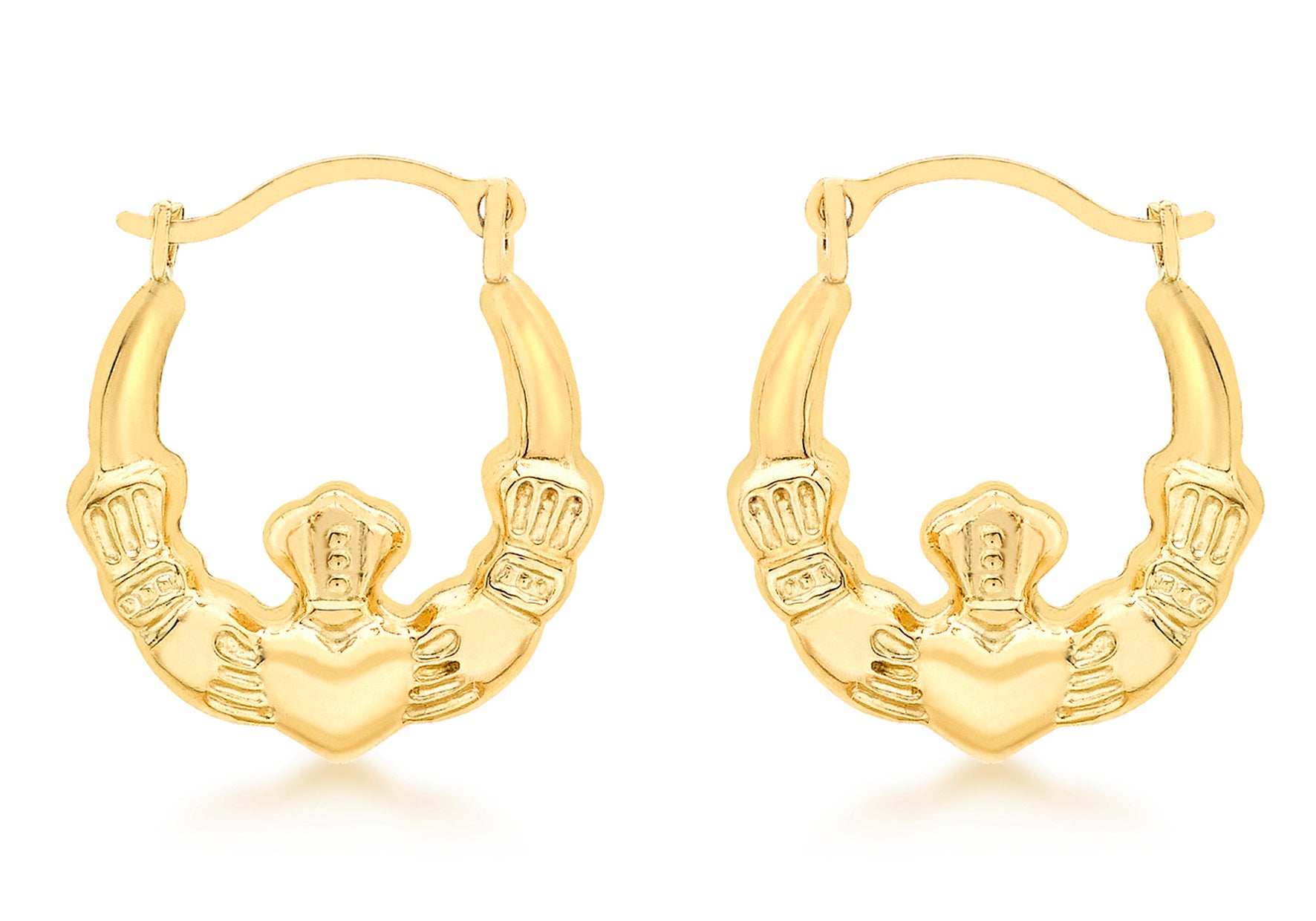 Details: Inner 9.5mm x 8.5mm, Tube Width Top to Hands 1.5mm-3mm Width: 14mm Height: 17mm Finish: Polished Fitting: Hinged Post Style: Creole Product Type: Earrings Metal Colour: Yellow Metal: 9ct Gold