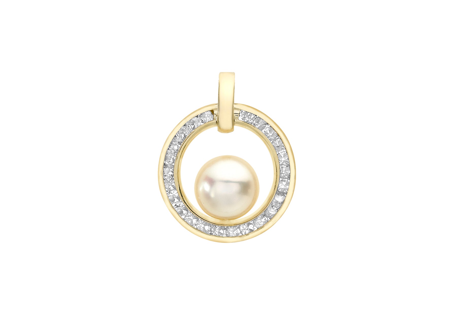 Pendant Height: Including Bail 16.5mm Pendant Width: 13.2mm Finish: Polished Setting: Channel Stone Details: 1 x 6.1mm Pearl, 22 x 1.5mm CZ White Round CZs Style: Stone Set Product Type: Pendants Metal Colour: Yellow Metal: 9ct Gold