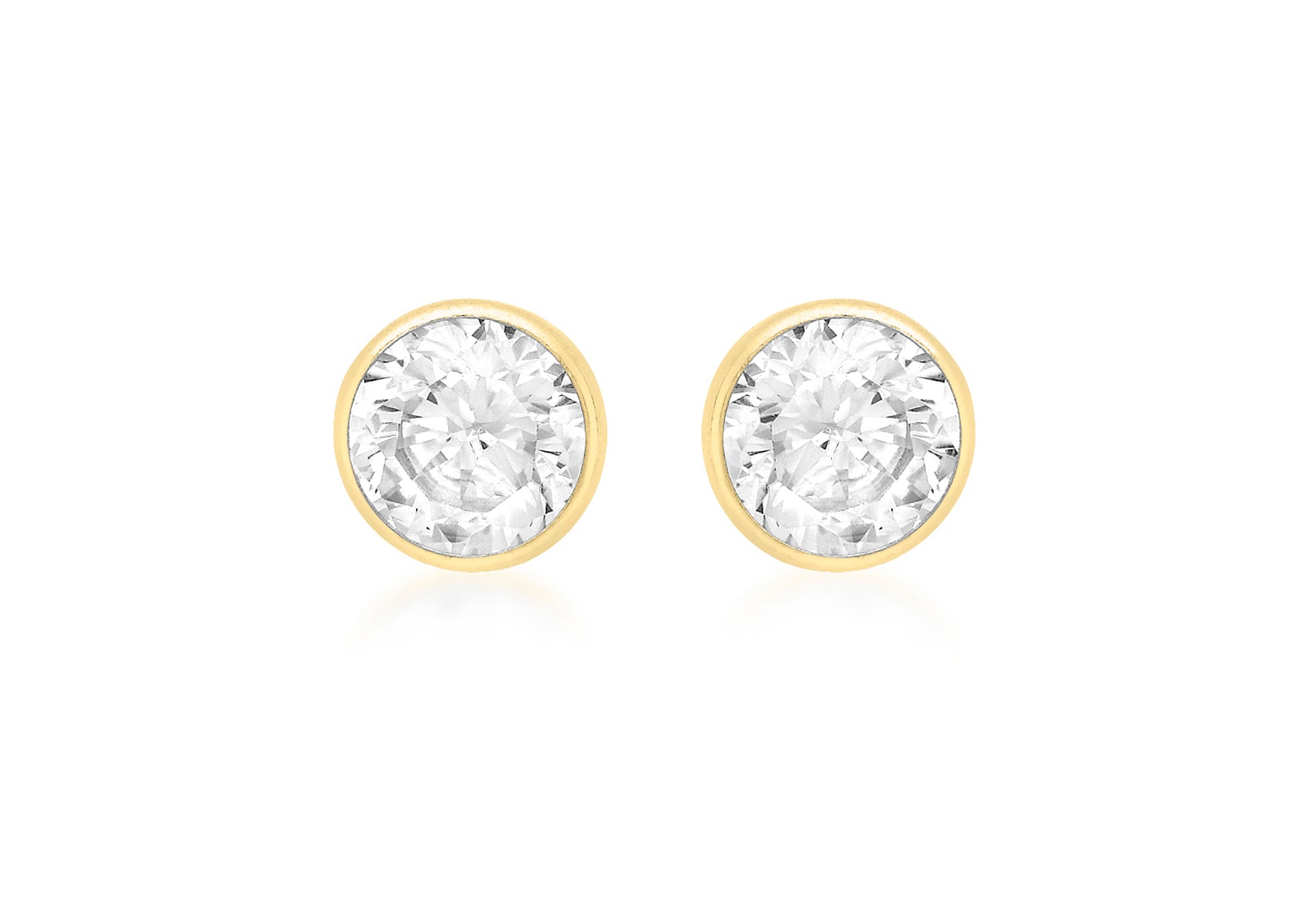 Diameter: 5.3mm Finish: Polished Fitting: Post Setting: Rubover Stone Details: 2 x 5mm Round White CZs Style: Stud Product Type: Earrings Metal Colour: Yellow Metal: 9ct Gold