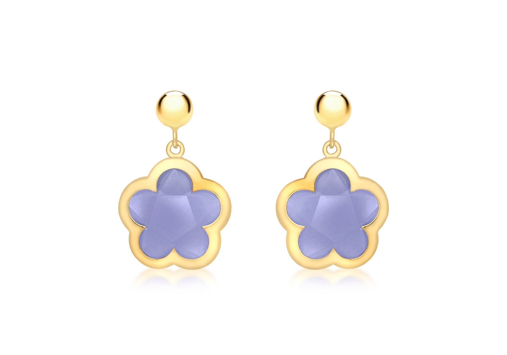Delicate and vibrant, these drop earrings are crafted in fine yellow gold and adorned with a charming blue crystal flower motif. Suspended beneath, a polished gold ball adds movement and understated shine, providing balance to the vivid floral detail.