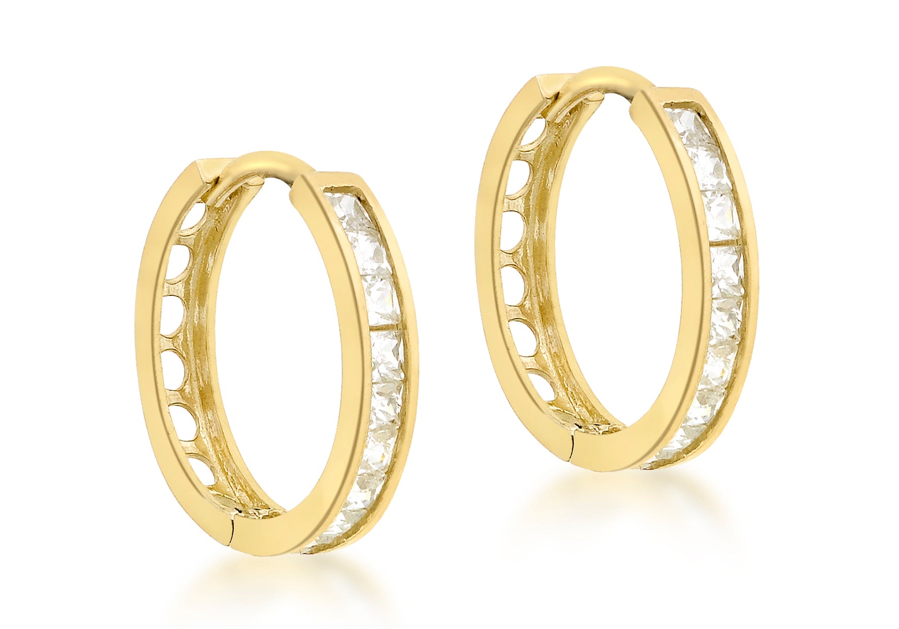 Width: Tube 2.65mm Diameter: 15mm Finish: Polished Fitting: Creole Setting: Channel Stone Details: 20 x 1.75mm Square White CZs Style: Creole Product Type: Earrings Metal Colour: Yellow Metal: 9ct Gold