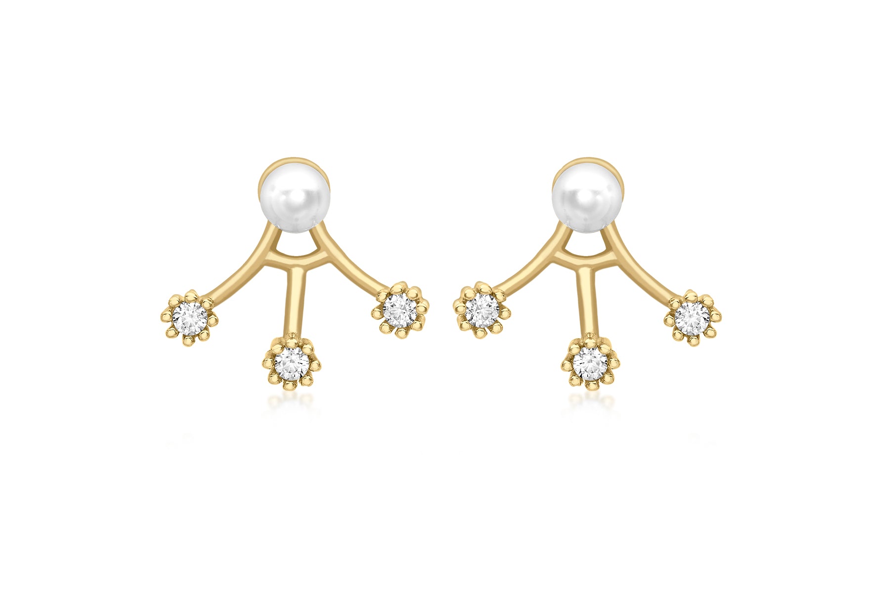 9ct Yellow Gold Zirconia and Pearl Fan Jack Earrings