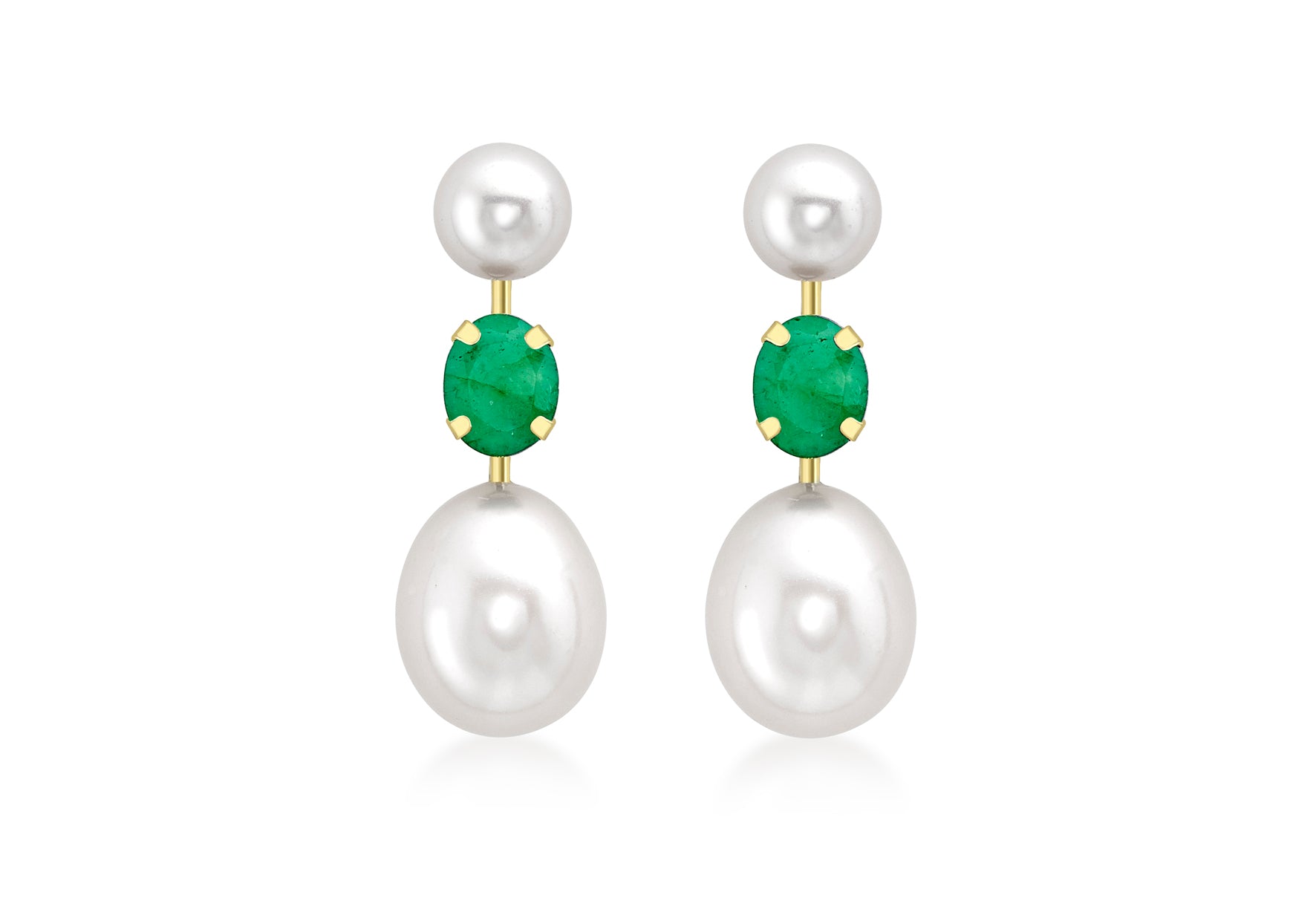 Delicately poised, these Earrings feature vivid emeralds set above a graceful pairing of freshwater pearls. The double-pearl arrangement adds layered movement, while the green brilliance of the emerald brings a refined contrast to the soft lustre below. Suspended from slender fine gold stems, the design is both contemporary and classic elegant in form, yet rich in natural character. A sophisticated choice for moments that call for understated distinction.