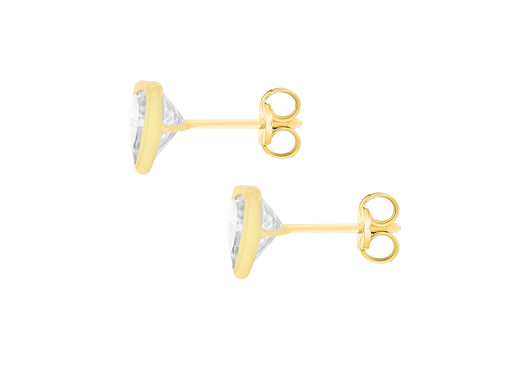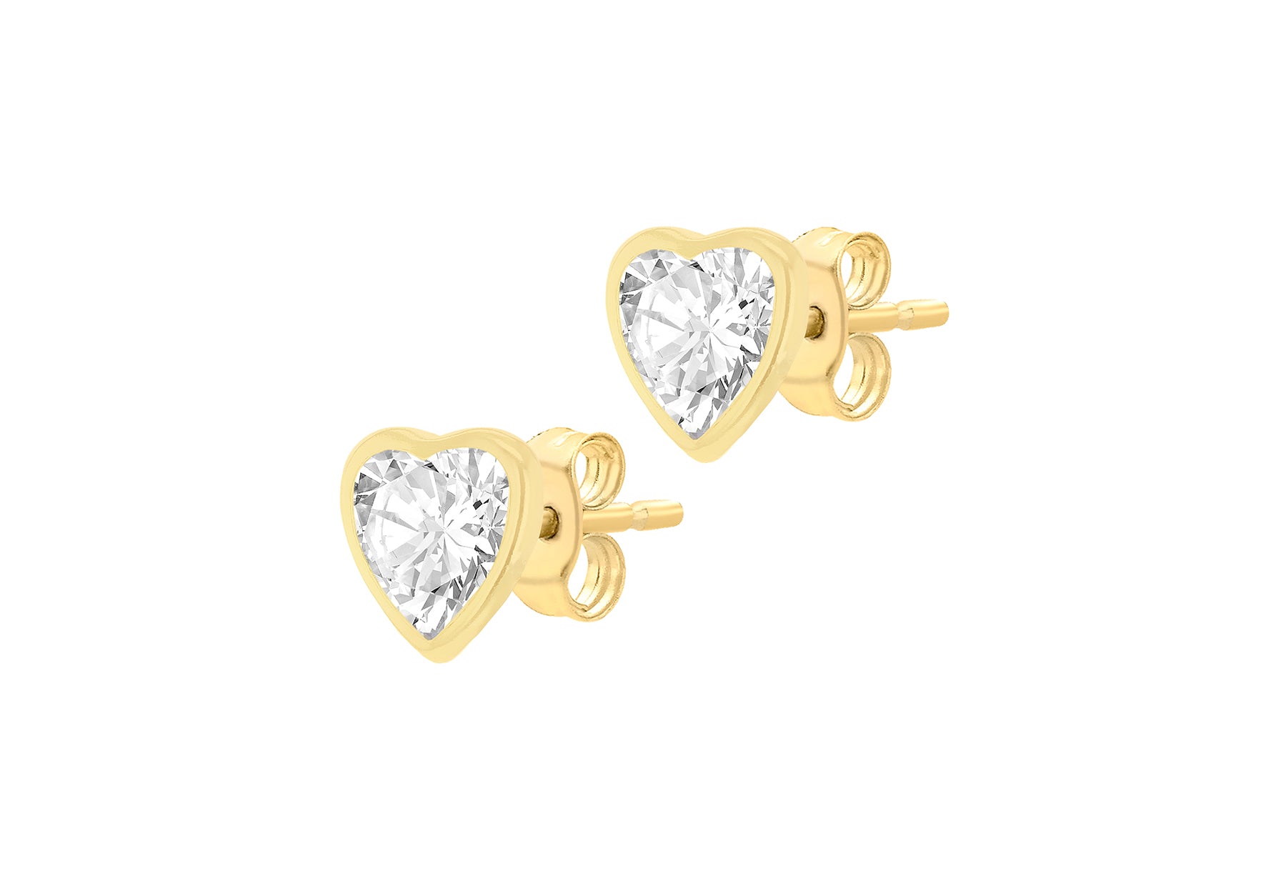 Details: Depth 3mm Width: 6.5mm Height: 6.5mm Finish: Polished Fitting: Post Setting: Bezel Stone Details: 2 x 6mm Heart White CZ Style: Stud Product Type: Earrings Metal Colour: Yellow Metal: 9ct Gold