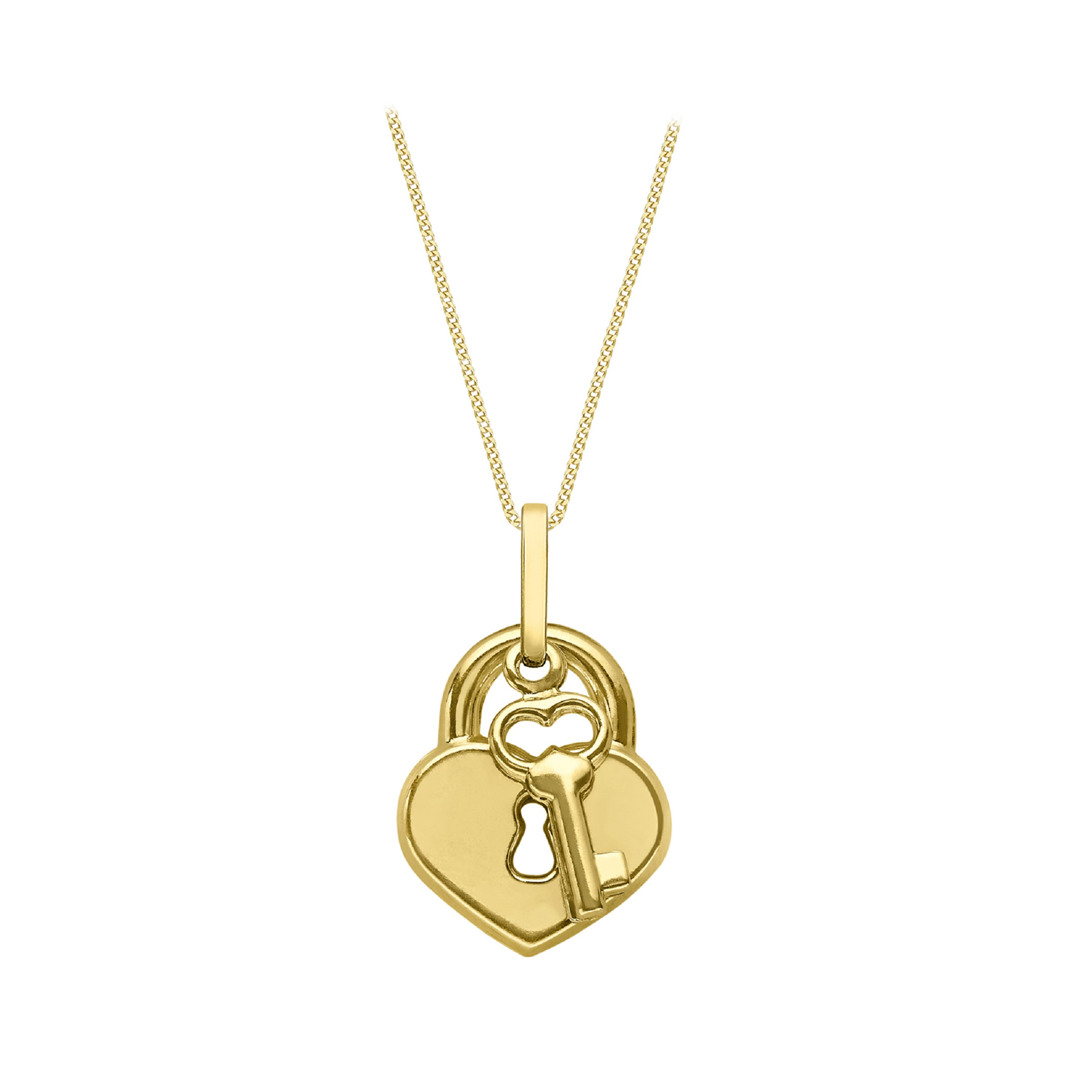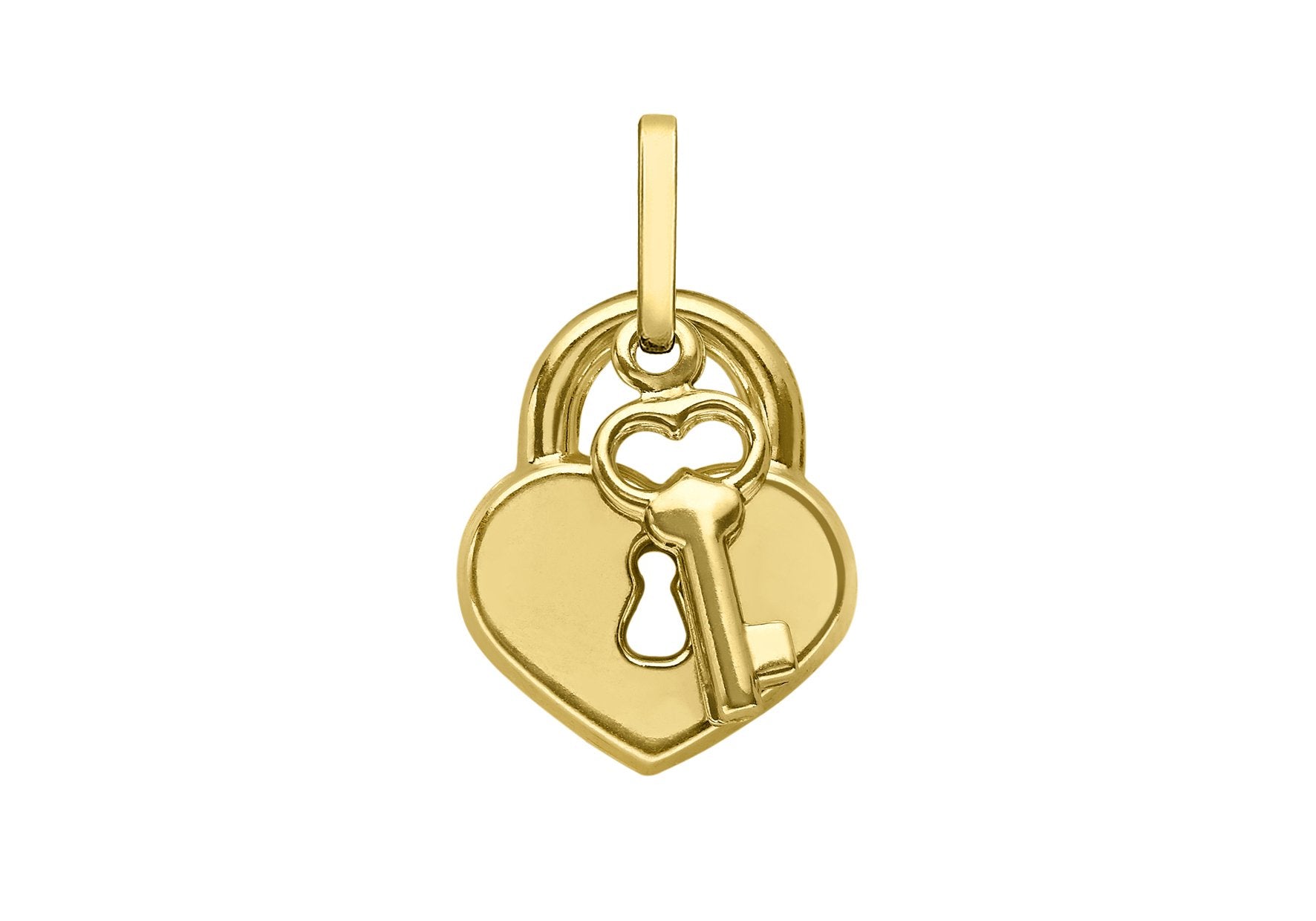 Meticulously crafted from high-polished fine yellow gold, this pendant features a classic padlock motif paired with a delicately detailed key charm. The two elements dangle side by side, creating a sense of playful romance and personal significance.