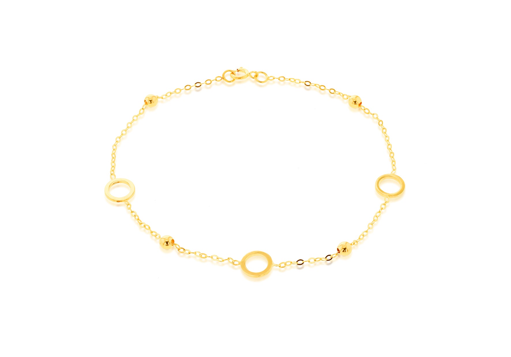 This bracelet boasts a stunning design that combines the warm, rich hues of solid 9ct yellow gold with delicate bead accents. The centrepiece of the bracelet is three finely crafted yellow gold rings, showcasing a polished surface that reflects light beautifully. This ring is surrounded by an array of meticulously arranged gold beads that add texture and depth to the overall look.