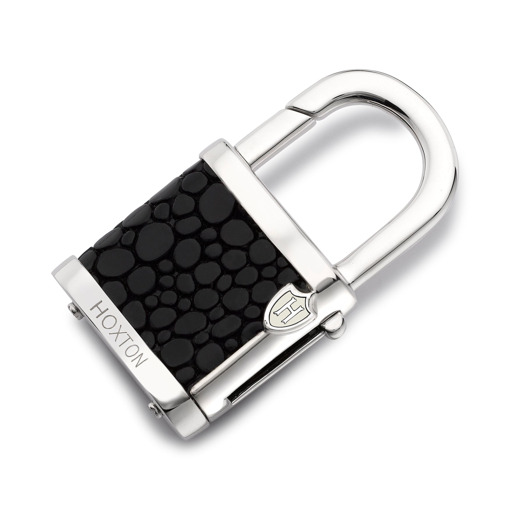 The Hoxton Sterling Silver Black Leather Padlock Keyring is the perfect blend of style and function. The keyring is crafted from high-quality sterling silver and features a sleek black leather overlay. The padlock design adds a touch of elegance and sophistication, making it a great accessory for both men and women.