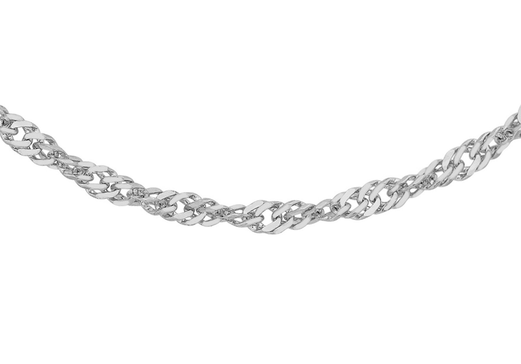 The chain offers a modern take on a timeless style, crafted in one of the most durable and prestigious precious metals. Its links are formed in the classic curb style but with a gentle twist, creating additional angles that reflect the light and give the chain a subtle textured brilliance. Measuring 20 gauge in strength, the chain has a refined yet substantial presence, lying flat and smoothly against the neckline for comfortable wear.