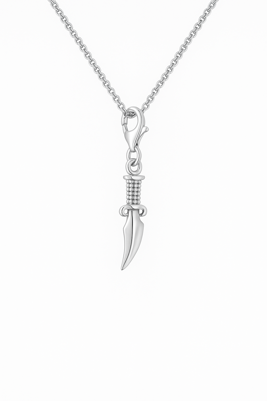 The charm is styled with sharp definition and a sleek, symbolic form. Cast in polished sterling silver, the miniature dagger boasts a tapered blade and a balanced hilt, capturing intricate details in a compact size. The oxidised accents highlight its contours, giving depth and character to the design.