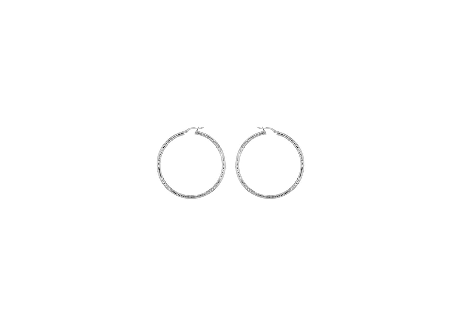 Details: Round Tube Width 3mm; Diameter: 30mm; Finish: Diamond Cut; Fitting: Hinged Post; Style: Creole Metal Colour: Silver Metal: Silver