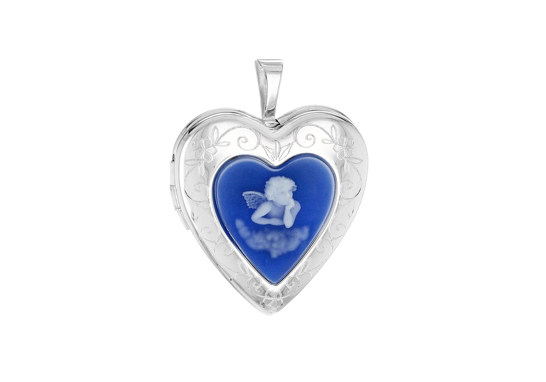 The locket features a delicate heart-shaped design with a detailed blue cameo of a cherub set against the silver backdrop. The fine craftsmanship highlights the intricate relief of the cherub figure, lending the piece a timeless and poetic charm.