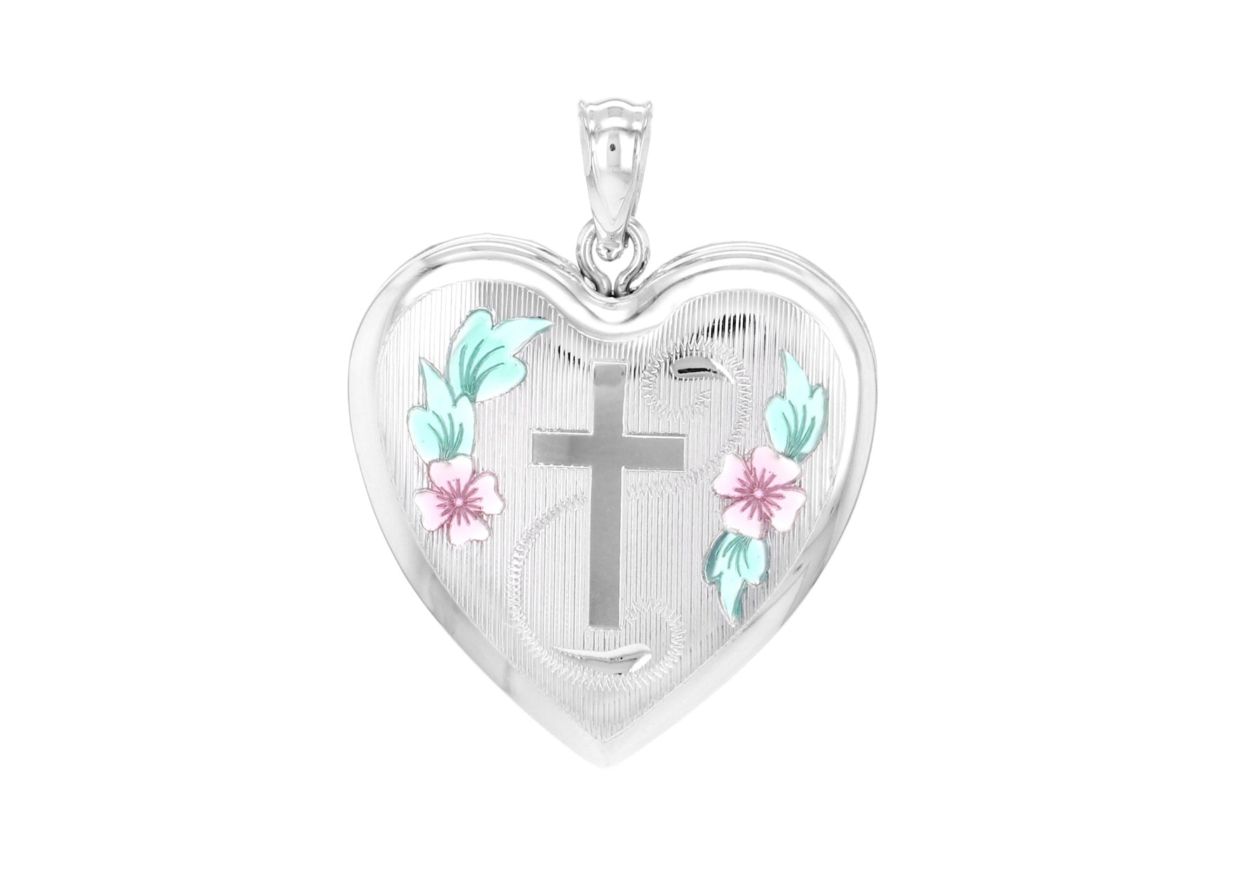 Sterling Silver Large Etched Cross and Rose Heart Locket