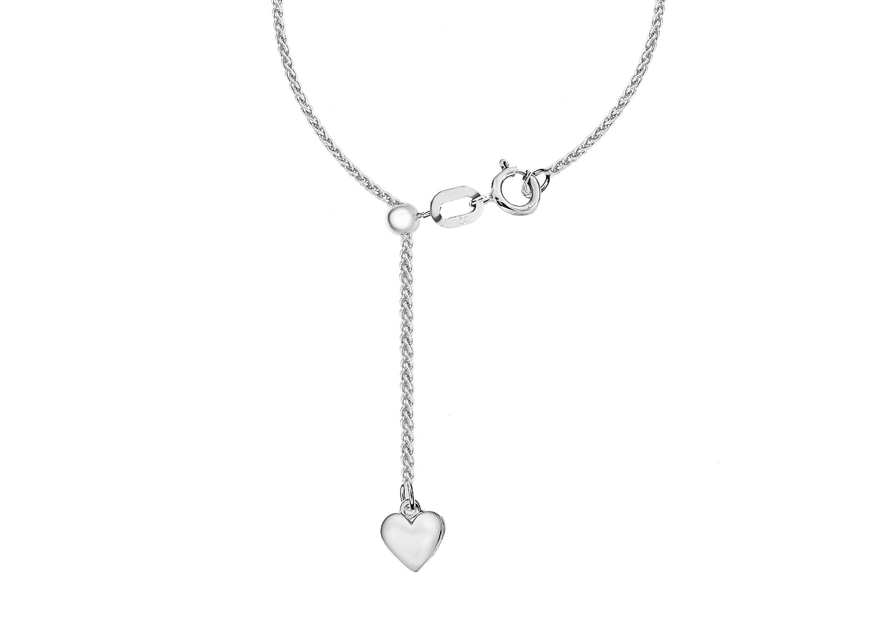 Details: 1 x 6.2mm x 9.5mm Heart Tag Length: 51cm/18" inches Width: Chain 1mm Finish: Rhodium Plated Clasp: Adjustable Style: Spiga Product Type: Chains Metal Colour: Silver Metal: Silver