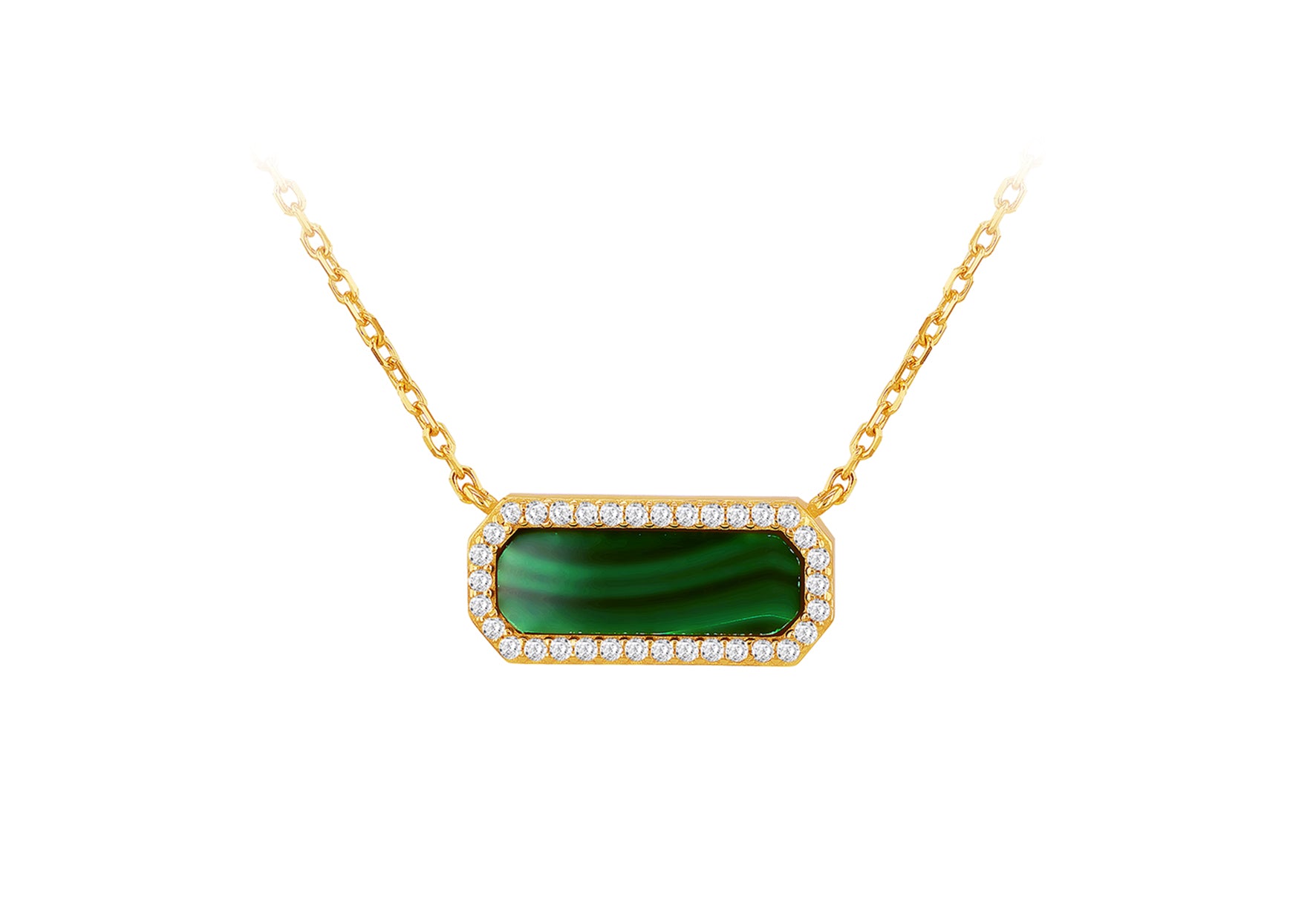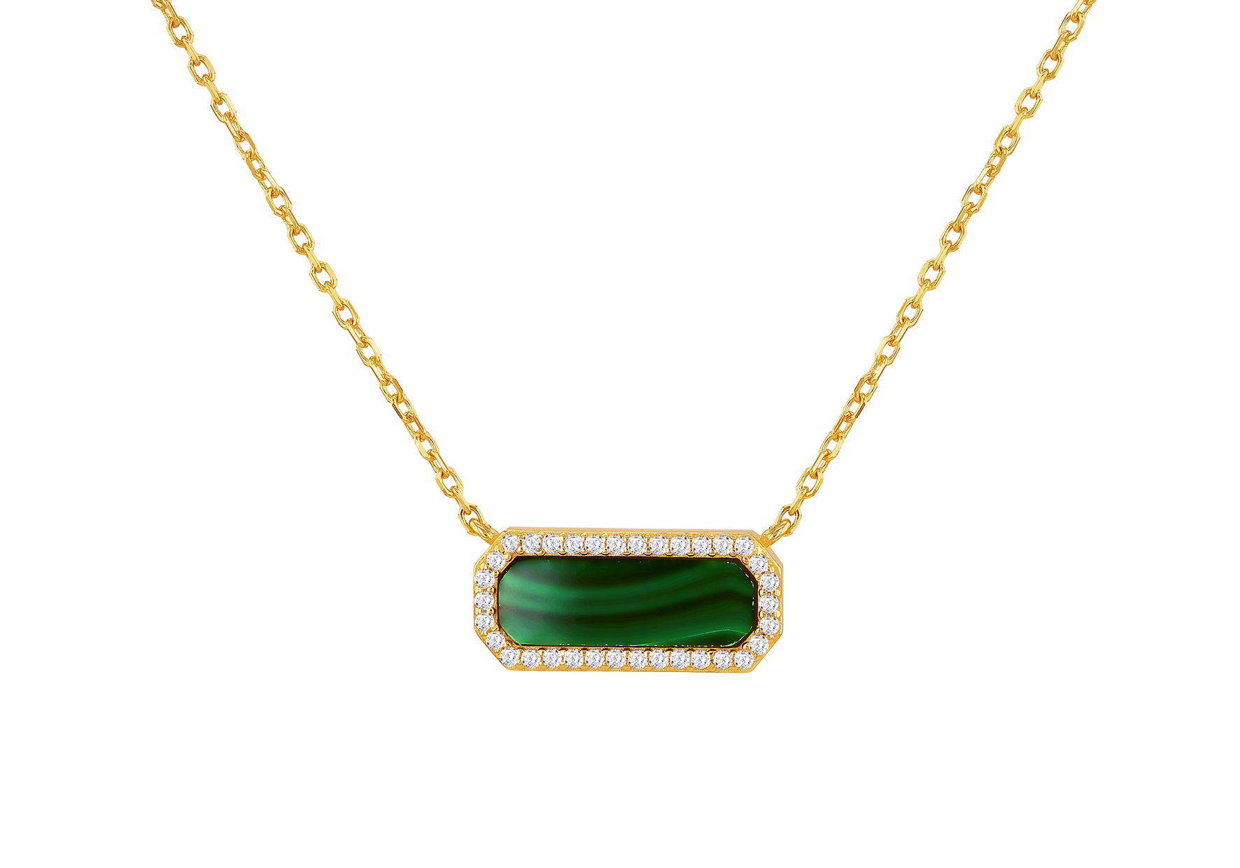 Pendant Height: 8mm Pendant Width: 19mm Length: 42-45cm Finish: Gold Plated / Polished Setting: Bezel/Claw Stone Details: 15mmx5mm Octagonal Malachite 34x1mm White CZ Clasp: Lobster Style: Stone Set Product Type: Necklaces Metal Colour: Yellow Metal: Silver